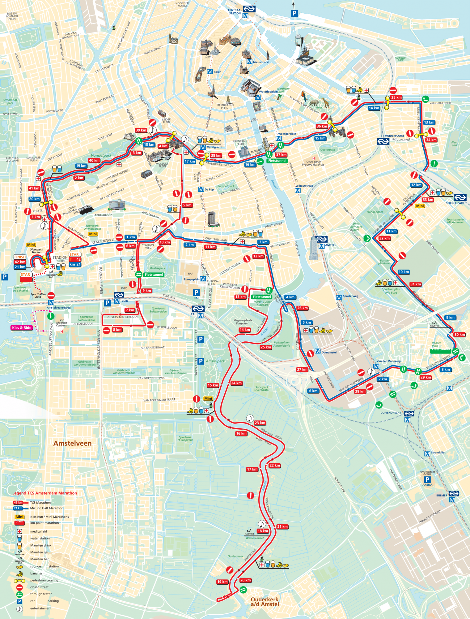La partenza della Mizuno Half Marathon è prevista da Stadionweg. Seguirà un percorso suggestivo attraverso le strade più belle della città, che tocca i monumenti più famosi come il Maritime Museum ed il Rikjsmuseum. Ci saranno sei differenti corral di partenza a seconda dei tempi d’arrivo previsti, riportati sulla scheda di partecipazione: